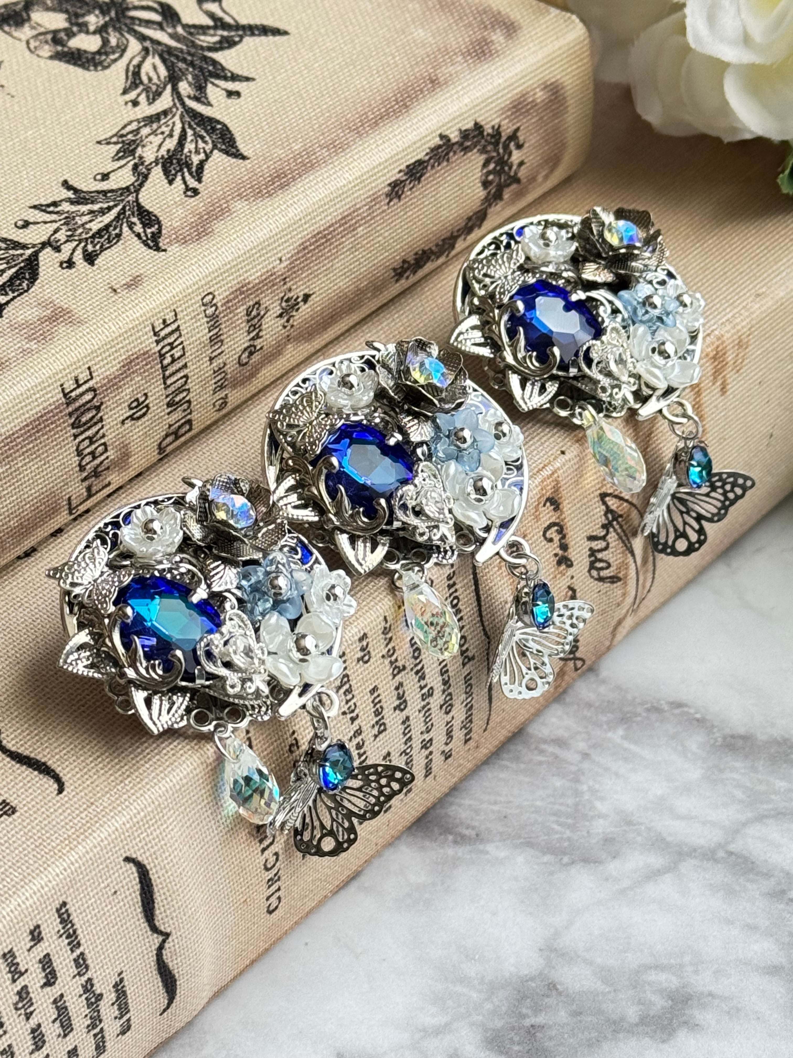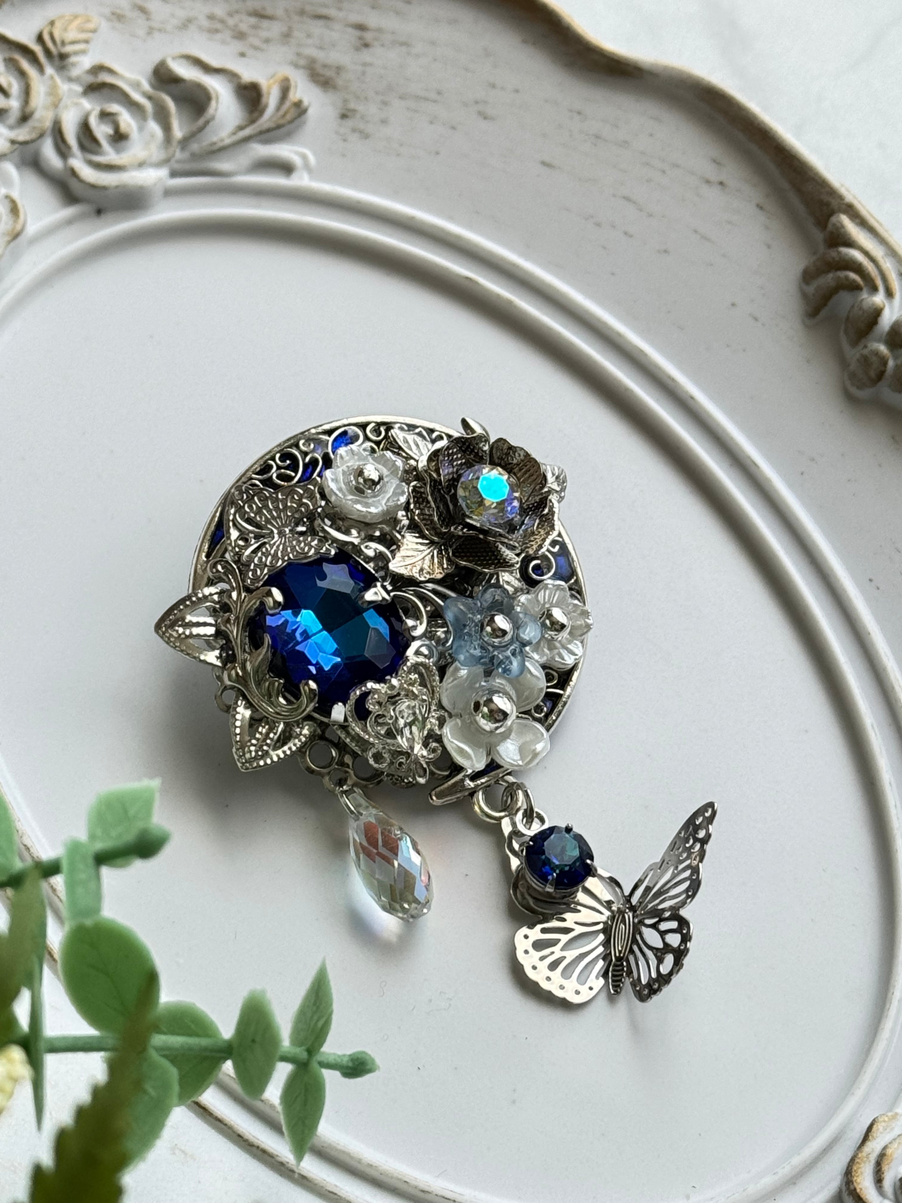 青いミラークロームを背景色にした月のパーツに大ぶりの美しいバミューダブルーのガラスビジュー、パールカラーのフラワービーズなどを組み合わせています。