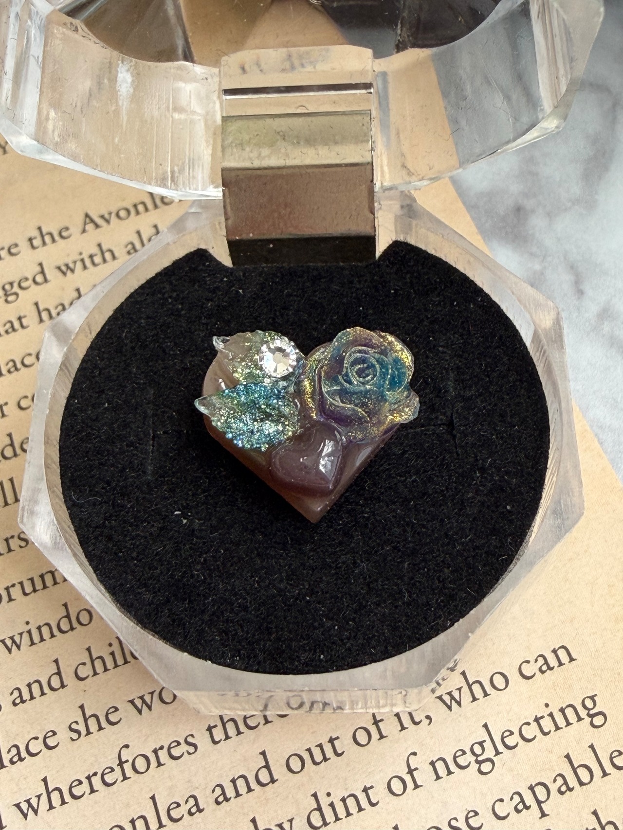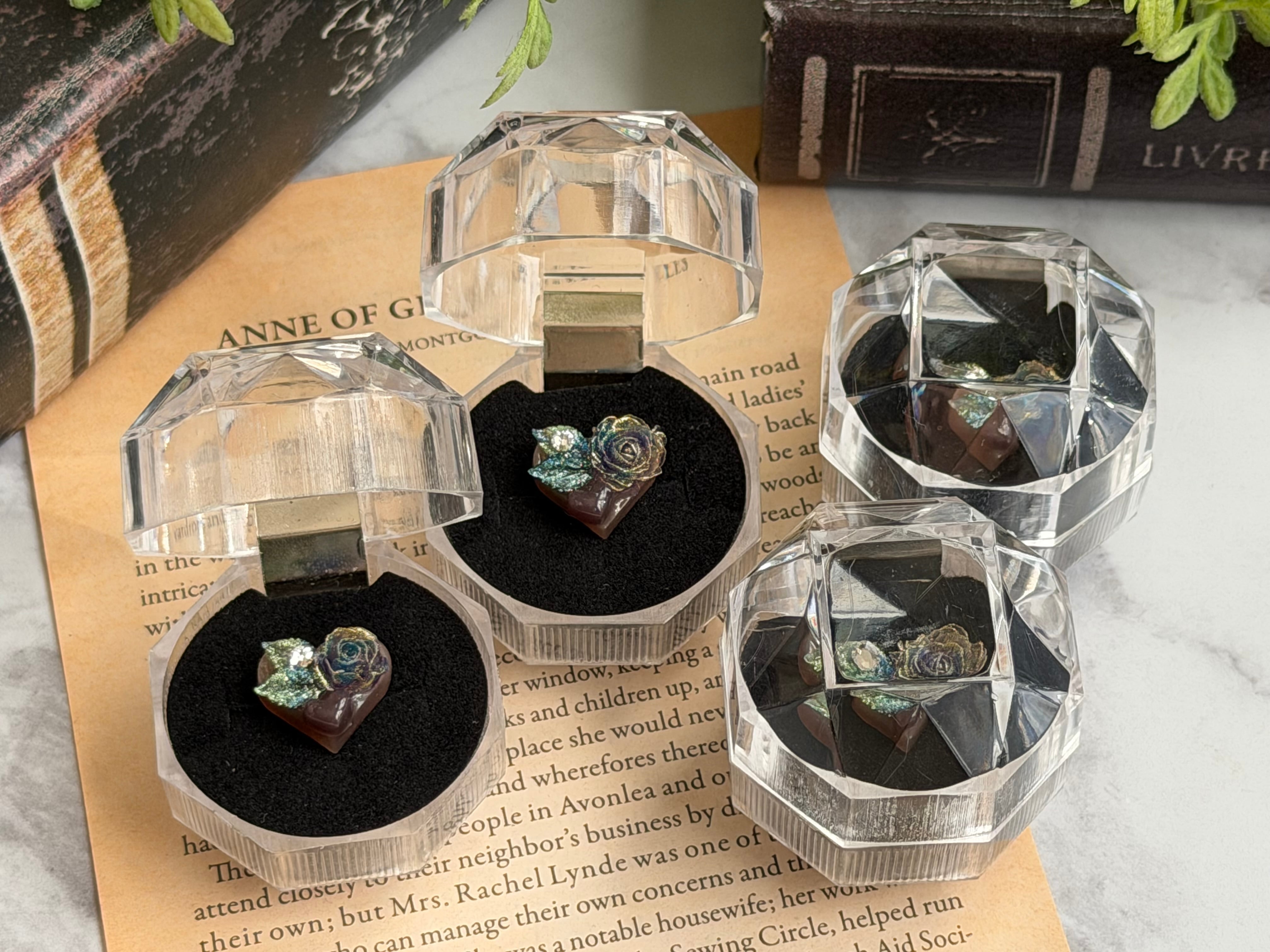 レジンで丁寧に作り上げたこのピンズは、まるで本物の砂糖菓子がトッピングされたチョコのようでとても可愛いらしいです。