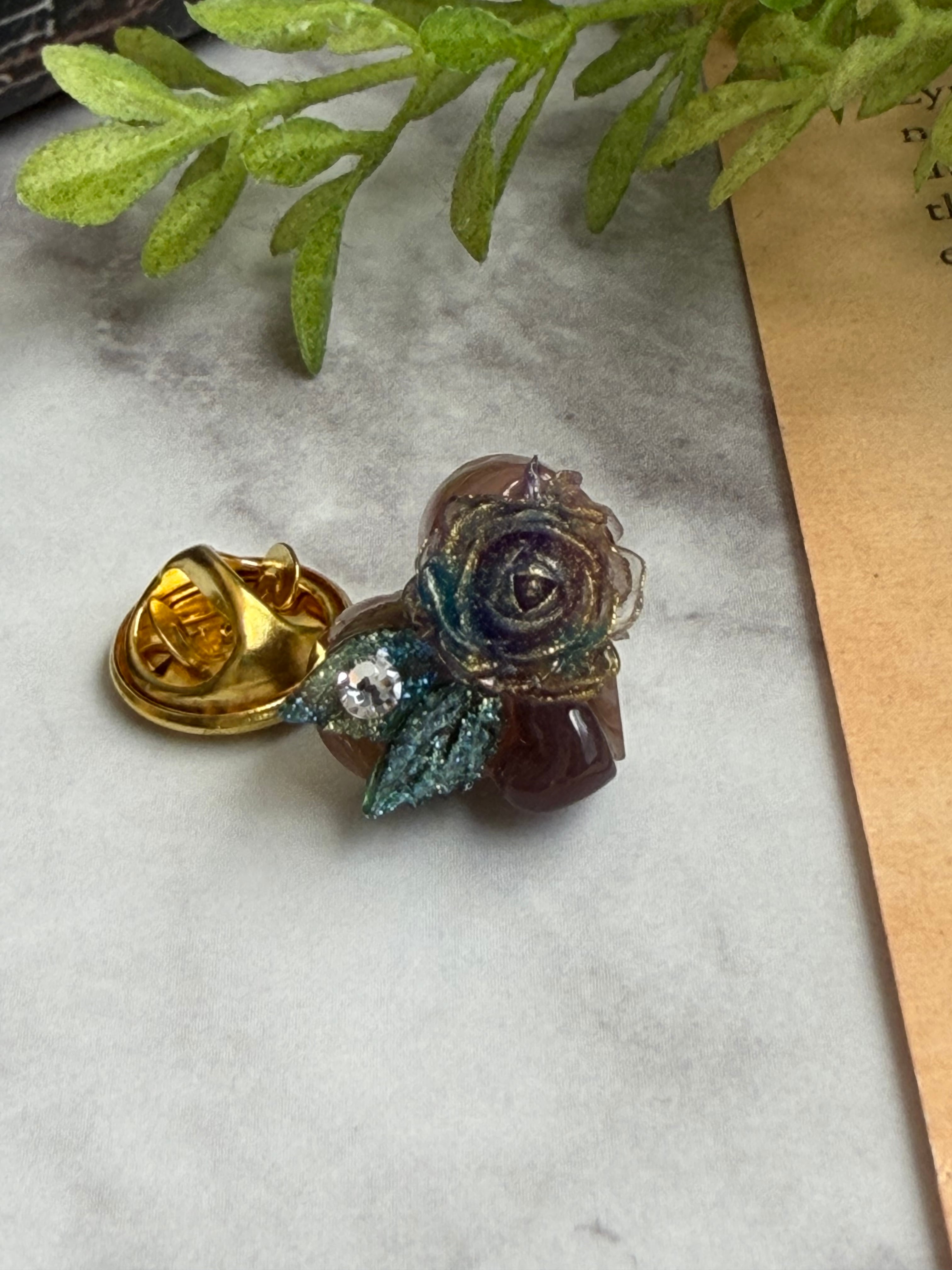 優しい甘さと可愛らしさを持つ、砂糖菓子のお花がのったハート型のチョコモチーフピンズ。