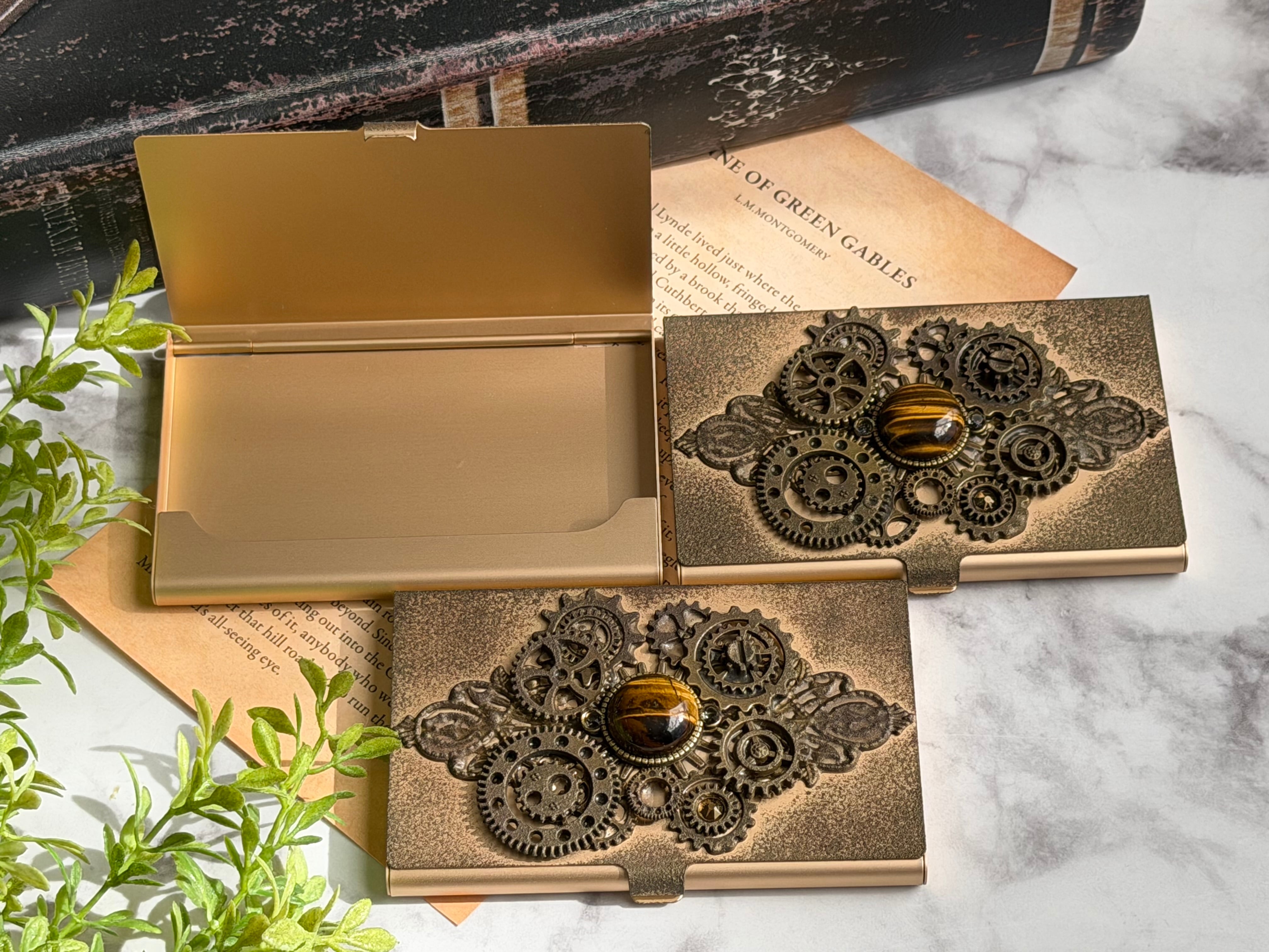 このカードホルダーは、軽量なアルミの素材で作られており、スチームパンクなデザインが特徴です。印象的な外観は、ビジネスシーンでもあなたのセンスを際立たせ、周囲の視線を集めること間違いなしです。また、天然石タイガーアイが装飾として施され、仕事運や金運に効果を期待できるポイントも魅力的です。